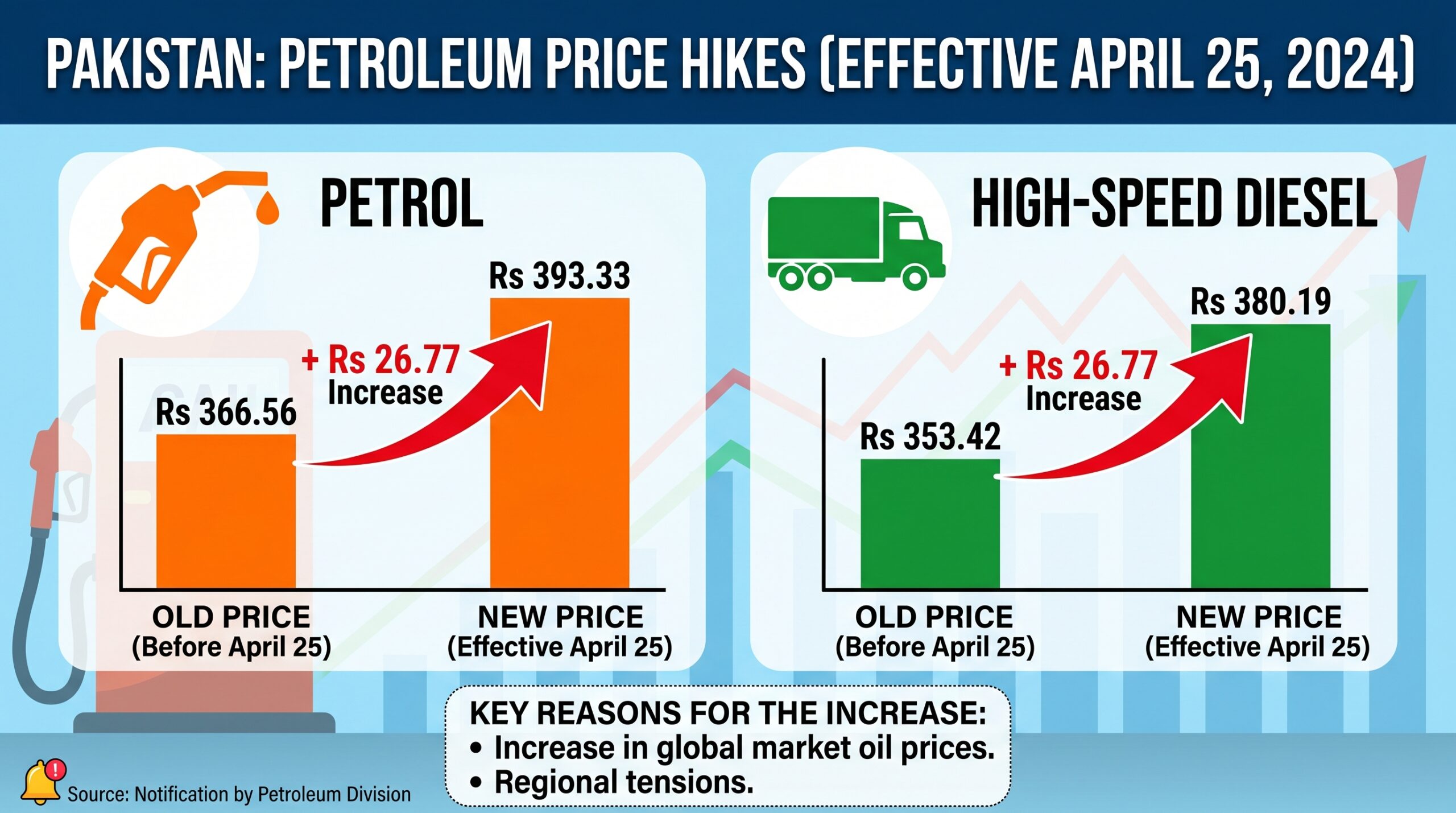 نئی قیمتوں کے تحت ہائی اسپیڈ ڈیزل کی قیمت بڑھ کر 380 روپے 19 پیسے فی لیٹر ہو گئی ہے، جبکہ پیٹرول کی نئی قیمت 393 روپے 33 پیسے فی لیٹر مقرر کی گئی ہے۔
